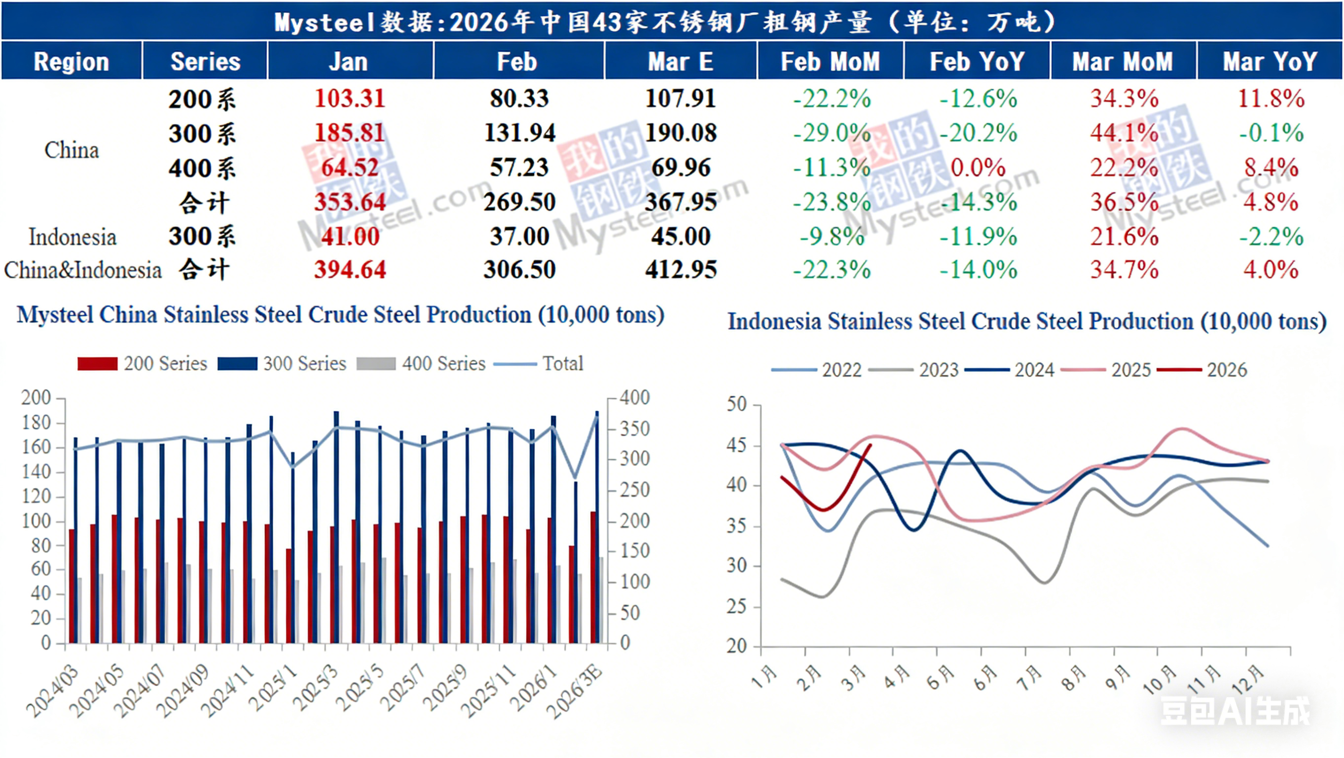 It is estimated that in 2026, the crude stainless steel output of 43 domestic stainless steel mills will reach 41.09 million metric tons, an increase of 1.09 million metric tons or 2.73% year-on-year. Specifically: Series 300 will be 21.4829 million metric tons, up 500,000 metric tons or 2.38% year-on-year; Series 200 will reach 11.8457 million metric tons, an increase of 190,000 metric tons or 1.63% year-on-year; Series 400 will be 7.7578 million metric tons, up 400,000 metric tons or 5.44% year-on-year.